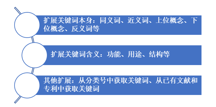 構(gòu)建檢索式時,擴(kuò)展檢索關(guān)鍵詞,能有效避免漏檢。關(guān)鍵詞擴(kuò)展思路有下圖三類。