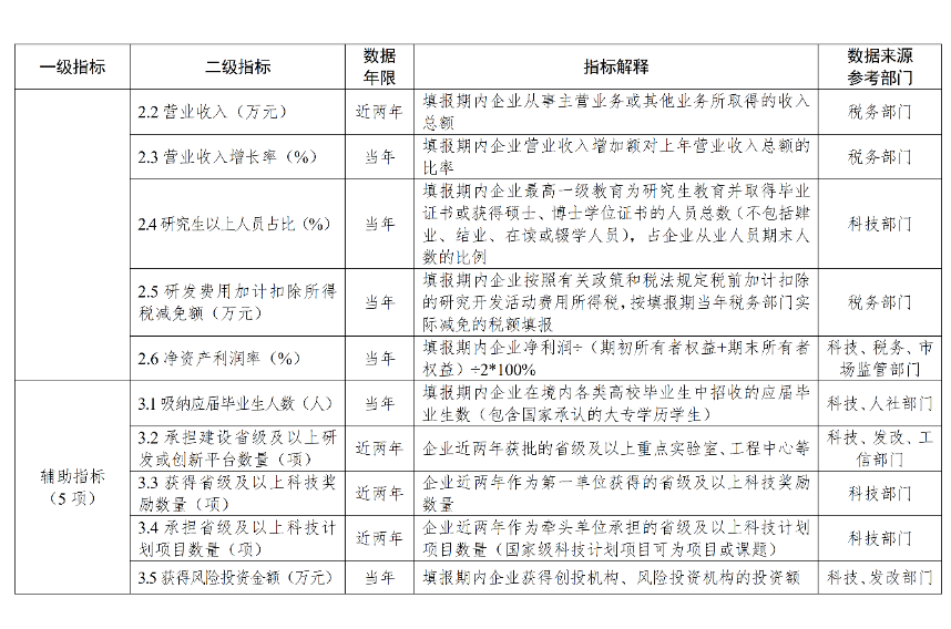 第二類是成長經(jīng)營指標。該類指標衡量企業(yè)長期可持續(xù)的成長經(jīng)營能力,具體包括高新技術(shù)產(chǎn)品收入、營業(yè)收入、營業(yè)收入增長率、研究生以上人員占比、研發(fā)費用加計扣除所得稅減免額、凈資產(chǎn)利潤率等6個指標。