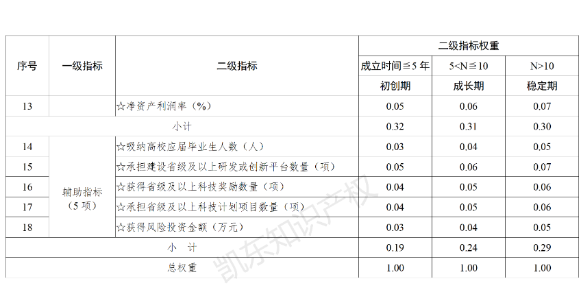 在指標權(quán)重設(shè)置上,以突出對企業(yè)創(chuàng)新能力評價、注重對企業(yè)成長經(jīng)營能力考察為導向,同時劃分了初創(chuàng)期、成長期、穩(wěn)定期企業(yè)不同階段,確定了3類一級指標及18個二級指標的權(quán)重賦值(見下圖),