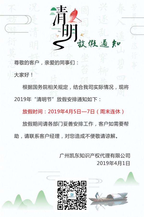 >>新聞資訊>>2019廣州凱東知識(shí)產(chǎn)權(quán)“清明節(jié)”放假安排通知