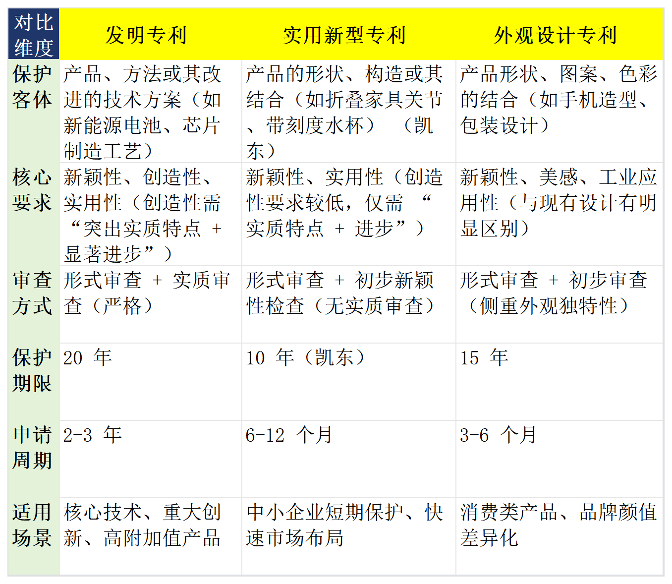我國《專利法》明確將專利分為發(fā)明專利、實用新型專利、外觀設(shè)計專利三類,三者在保護客體、審查標(biāo)準(zhǔn)等方面差異顯著,具體對比如下: